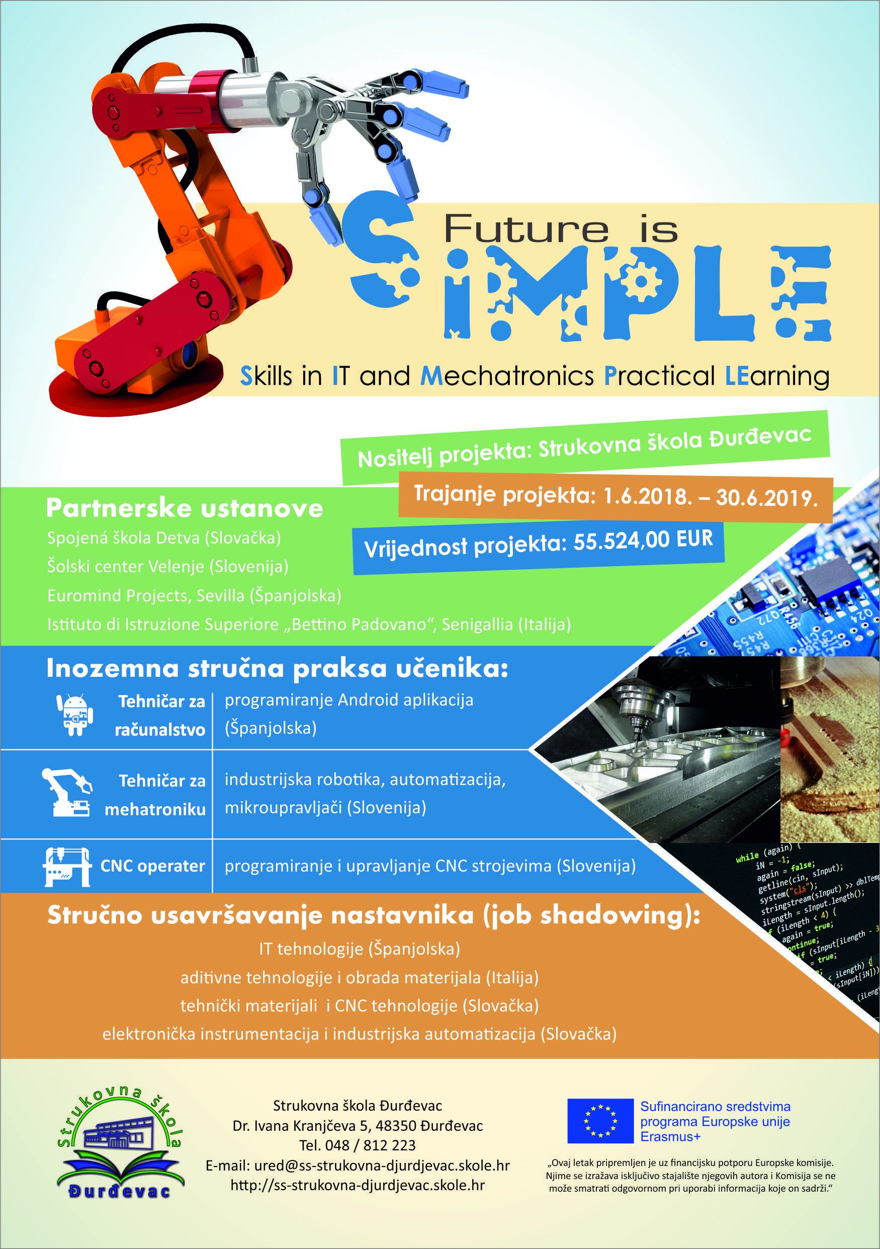 Projektom „Skills in IT and Mechatronics Practical LEarning“ (SIMPLE) cilj je učenicima elektrotehničkih i strojarskih zanimanja kroz stručnu praksu u inozemstvu omogućiti stjecanje neophodnog znanja i praktičnih vještina za uspješno uključivanje na vrlo dinamično tržište rada. Nositelj projekta je Strukovna škola Đurđevac, a u projekt su uključene partnerske ustanove iz Slovenije, Slovačke, Španjolske i Italije.