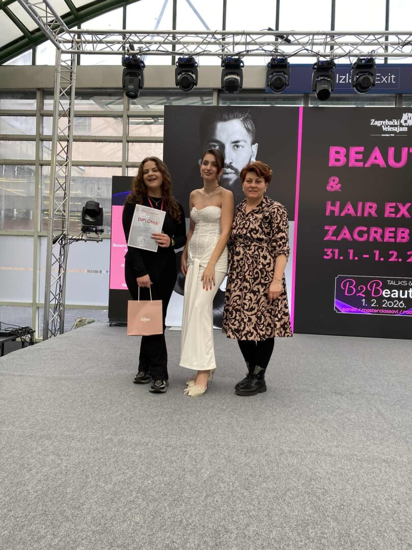 Učenici 2.f i 3.f razreda osobnih usluga i njihove stručne učiteljice Sonja Amidžić, Željka Grobenski Senjan i Anica Čorba posjetili su Beauty Hair Expo sajam 2026. na Zagrebačkom velesajmu. Tamo su imali priliku upoznati se s najnovijim trendovima, tehnikama i proizvodima iz svijeta frizerstva i kozmetike. Posjet je bio iznimno inspirativan te je učenicima omogućio povezivanje teorijskih znanja s praksom i uvid u aktualna zbivanja u struci.