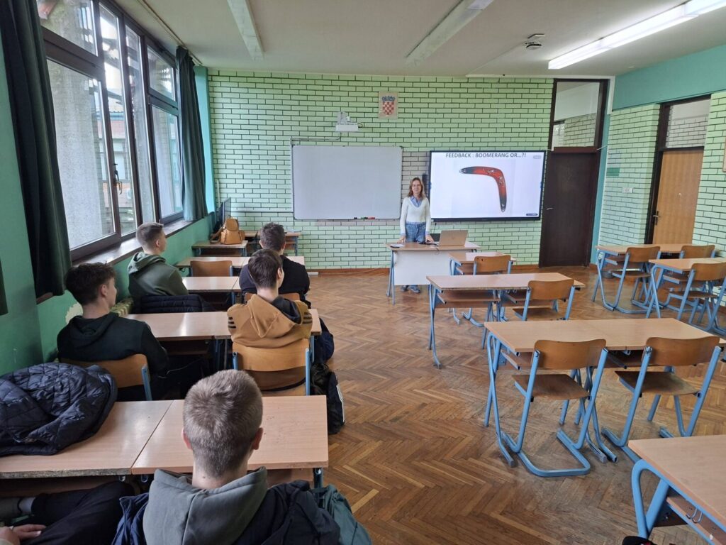 Tjedan cjeloživotnog učenja u našoj školi zaključili smo predavanjem i radionicom „Feedback: Boomerang or …?!“, koje je održano u utorak, 7. listopada 2025., a čiji je cilj bio osvijestiti razne izazove vezane uz međusobnu komunikaciju u današnje digitalno doba. Predavanje i radionicu održala je nastavnica Marina Pejić, a učenici koji su sudjelovali na radionici naučili su kako na konstruktivan, iskren i podržavajući način dati nekome povratnu informaciju u raznim svakodnevnim situacijama.