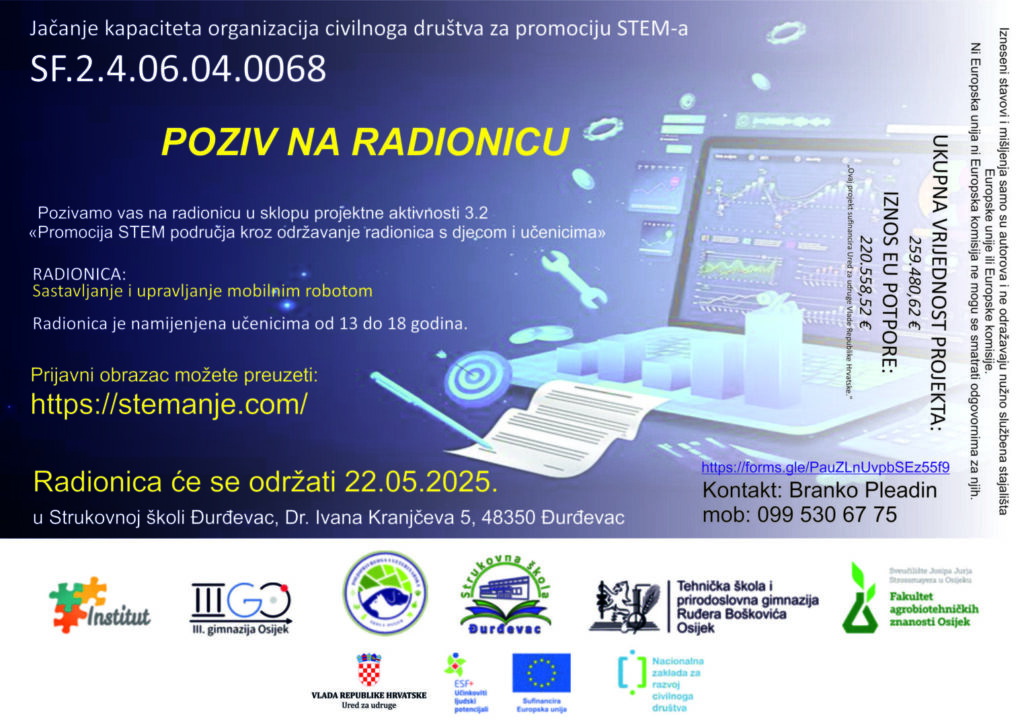 Radionica se provodi u okviru projekta “STEManje.com” sufinanciranog u okviru poziva “Jačanje kapaciteta organizacija civilnog društva za promociju STEM-a” (SF.2.4.06.04.0068).