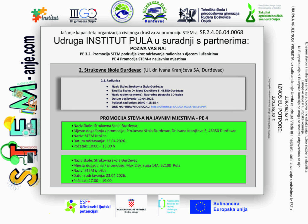 Udruga Institut Pula u suradnji sa Strukovnom školom Đurđevac u mjesecu travnju organizira STEM izložbe koje su namijenjene učenicima osnovnih i srednjih škola te svim zainteresiranim posjetiteljima.