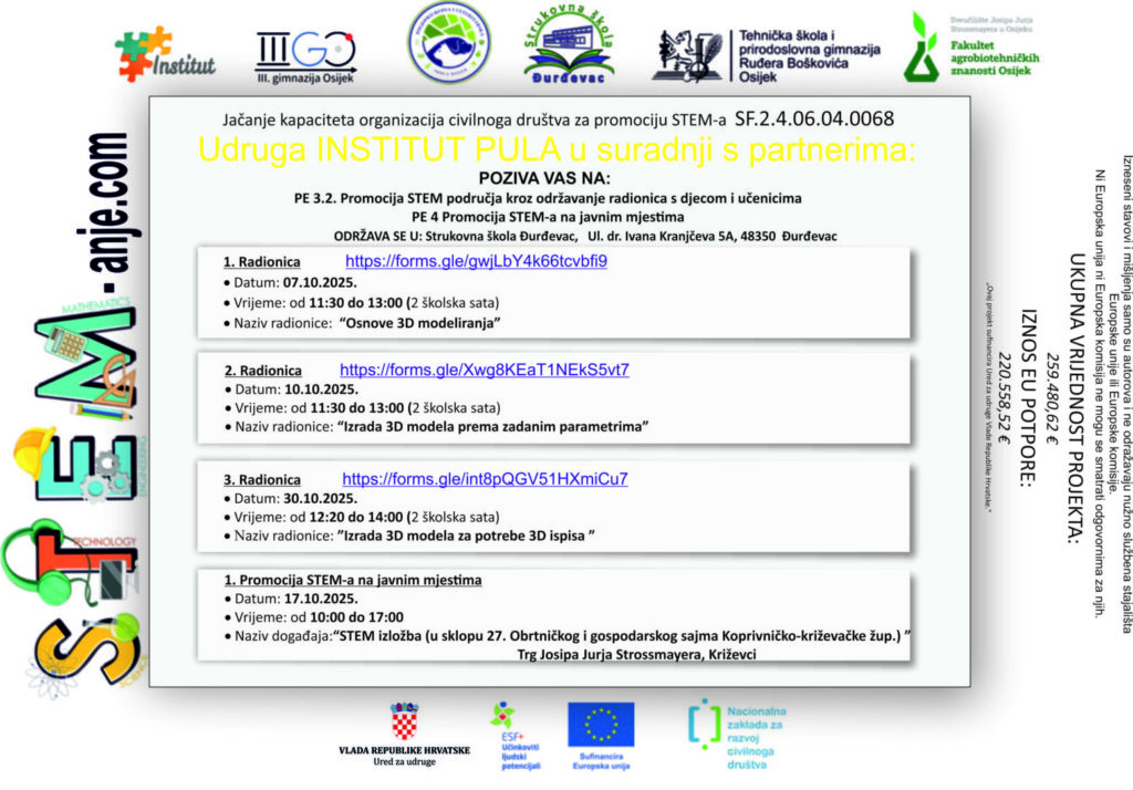 Udruga Institut Pula u suradnji sa Strukovnom školom Đurđevac organizira STEM izložbu koja je namijenjena učenicima osnovnih i srednjih škola te svim zainteresiranim građanima. STEM izložba održat će se 17. listopada 2025. u Križevcima (trg Josipa Jurja Strossmayera), u vremenu od 10:00 do 17:00 sati, a u sklopu 27. Obrtničkog i gospodarskog sajma Koprivničko-križevačke županije.