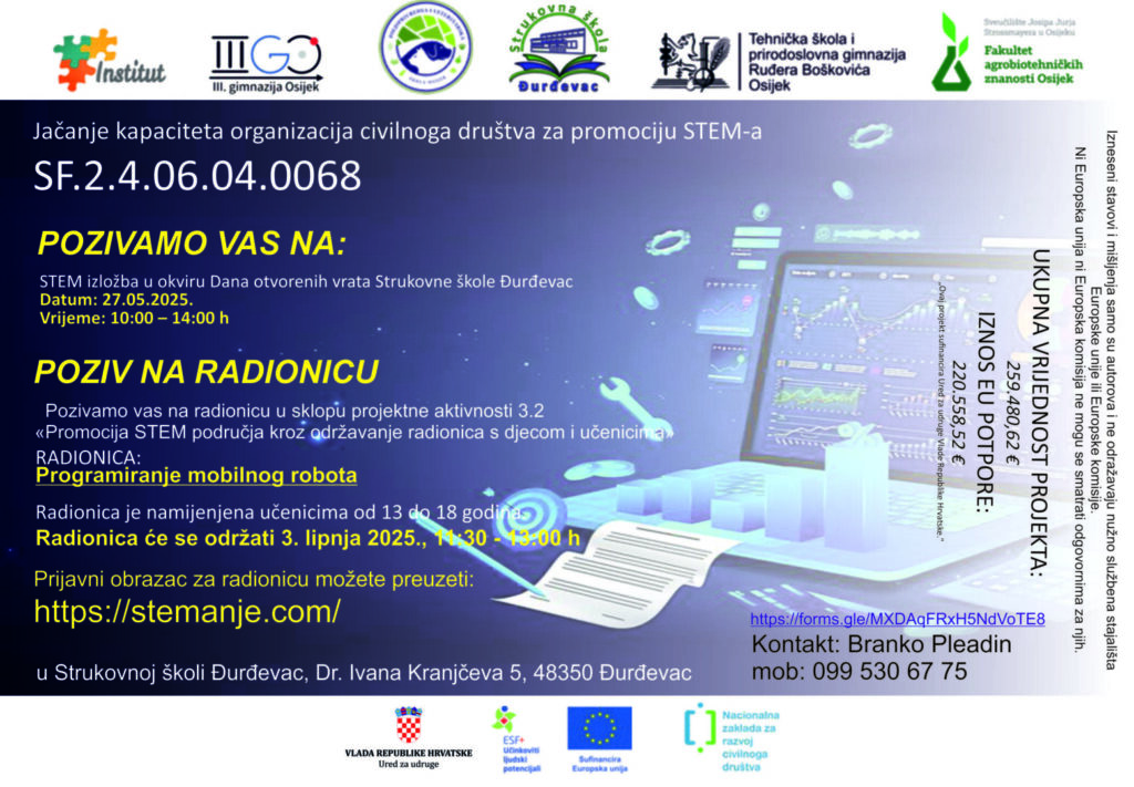 STEM izložba i radionica održavaju se u okviru projekta “STEManje.com” sufinanciranog u okviru poziva “Jačanje kapaciteta organizacija civilnog društva za promociju STEM-a” (SF.2.4.06.04.0068).
