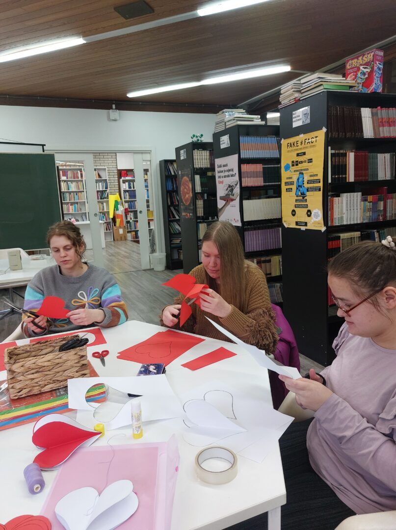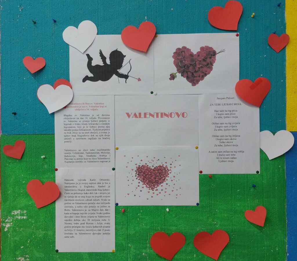 Ususret Valentinovu, u školskoj je knjižnici održana kreativna radionica izrade prigodnih ukrasa. Učenici su, uz pomoć svojih nastavnica, imali priliku pokazati maštovitost, a izrađeni radovi ukrasili su prostor školske knjižnice, školske hodnike i učionice, unoseći vedrinu i toplinu u naš svakodnevni školski život.