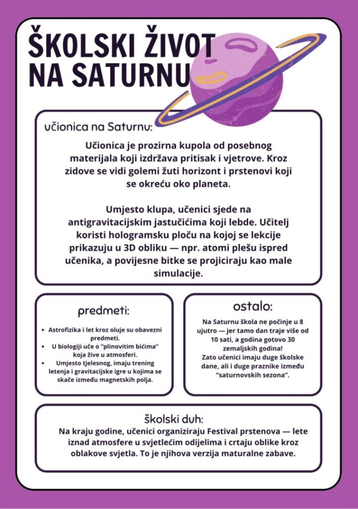 Nositelji ovog projekta su bile učenice 3.f razreda, smjera frizer, kozmetičar i pediker i njihova profesorica Zvjezdana Smes. Tijekom Svjetskog tjedna svemira smo održali nekoliko aktivnosti, poput prezentacija zamišljenih učionica na Saturnu i Neptunu, izrade modela rovera Perseverance koji odašilje podatke s Marsa od veljače, 2021. godine te kratkih predavanja i diskusija na temu života u svemiru i na pojedinim planetima Sunčeva sustava.